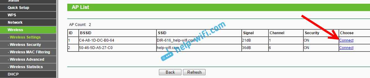 Выберите из списка нужную сеть, с которой роутер будет получать интернет. Напротив нужной сети нажмите на ссылку «Connect».