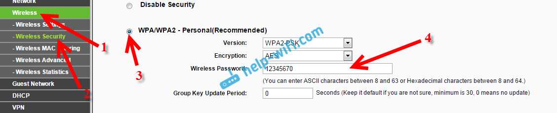 Не забудьте поставить пароль на Wi-Fi сеть, которую будет раздавать настроенный нами маршрутизатор. Можете посмотреть подробную инструкцию по защите Wi-Fi на Tp-Link. Там все просто. В настройках, на вкладке Wireless — Wireless Security, выделите пункт WPA/WPA2 — Personal(Recommended), в поле Wireless Password задайте пароль (минимум 8 символов), и нажмите снизу кнопку Save.