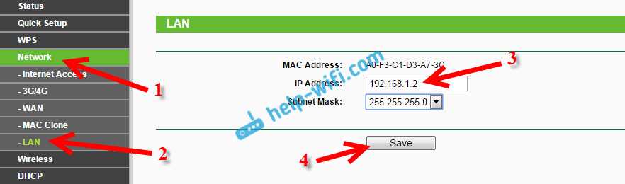Для начала, нам нужно сменить IP-адрес нашего Tp-Link. Это нужно для того, что бы в сети не было двух устройств с одинаковыми IP. Например, если у главного IP-адрес 192.168.1.1, и у второго — 192.168.1.1, то получится конфликт адресов. Перейдите на вкладку Network — LAN. В поле IP Address замените последнюю цифру с 1 на 2. У вас получится адрес 192.168.1.2, или 192.168.0.2. Нажмите кнопку Save. Роутер перезагрузится.