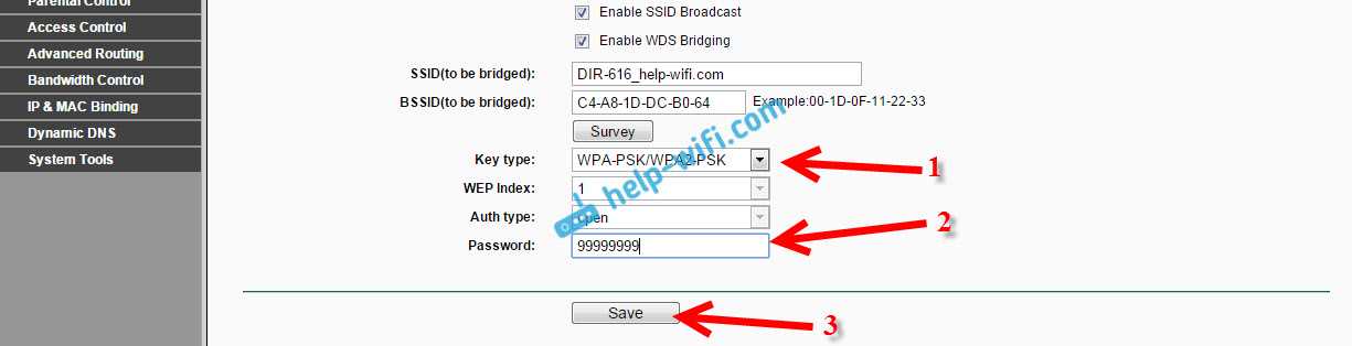 Нам осталось только напротив выпадающего меню Key type выбрать тип безопасности вашей сети (к которой мы подключаемся). И в поле Password указать пароль к этой сети. Для сохранения, нажмите на кнопку Save.