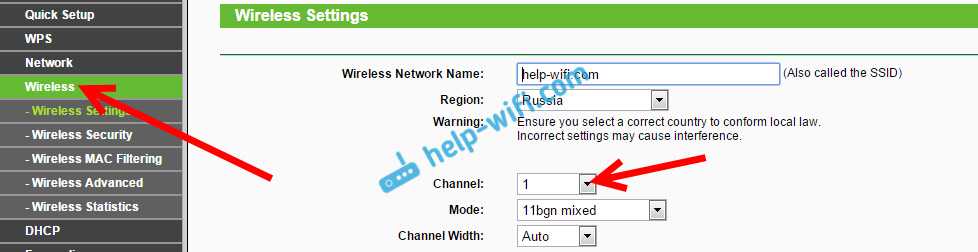 Если у вас например в качестве основного роутера так же Tp-Link, то канал можно сменить в настройках (которые открываются по адресу 192.168.1.1 (192.168.0.1), или смотрите эту инструкцию), на вкладке Wireless. В поле Channel укажите статический канал. Например 1, или 6. Нажмите кнопку Save для сохранения настроек.