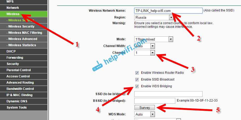 Теперь остается открыть вкладку «Wireless» -> «Wireless Settings», и установить галочку «Enable WDS…», но не спешите! Установите параметры, как показано ниже: