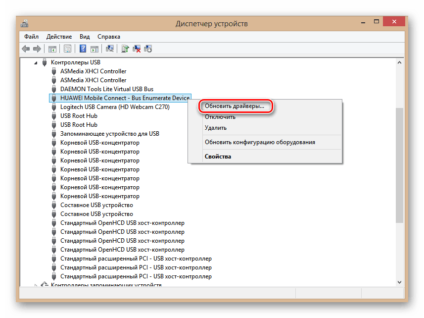 В развернувшемся перечне устройств находим свой USB-модем. Щёлкаем по этой графе ПКМ, в меню решаем «Обновить драйверы».