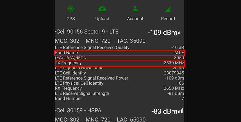 - Запустить программу и на главном экране посмотреть на параметры, где должны показываться «Band Number» и «TX Frequency». Частотный диапазон должен быть 2600 МГц, 1800 МГц или 800 МГц. Уровень сигнал не должен превышать 110 дБм, а asu быть ниже 38 или выше 43.