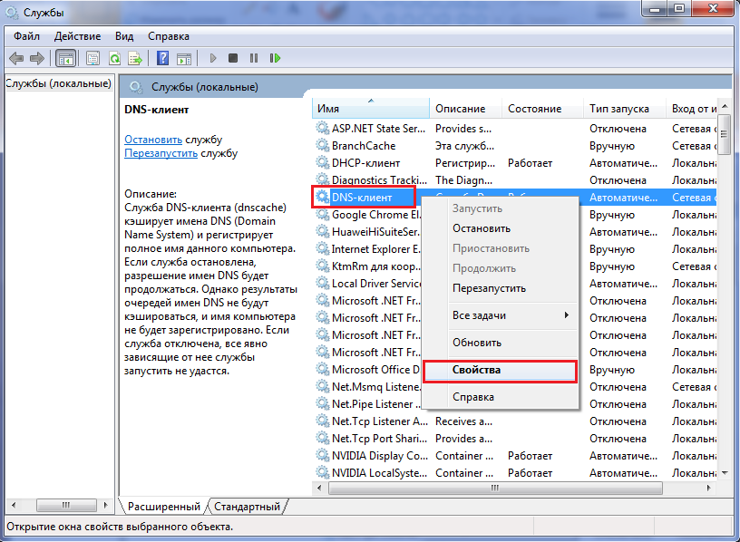 Также вы можете перейти в «Свойства» и проверить, корректно ли работает DNS-клиент Windows.