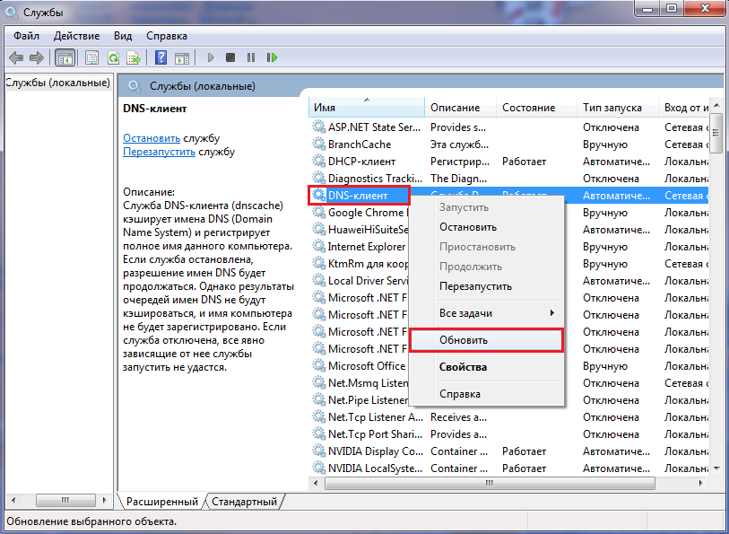 Появится окно «Службы». В списке вам нужно найти службу DNS-клиент, кликнуть правой кнопкой мыши и выбрать команду «Обновить».