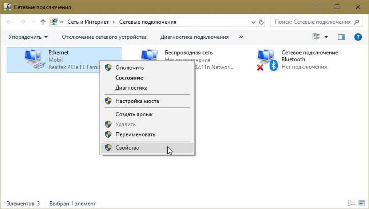 Выберите свое подключение, нажмите на правую кнопку мыши, кликните на пункт «Свойства».