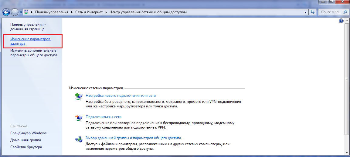 В панели управления выберите раздел «Центр управления сетями и общим доступом», открыв который вы увидите основные сведения о сети. В левой части окна выберите пункт «Изменение параметров адаптера».