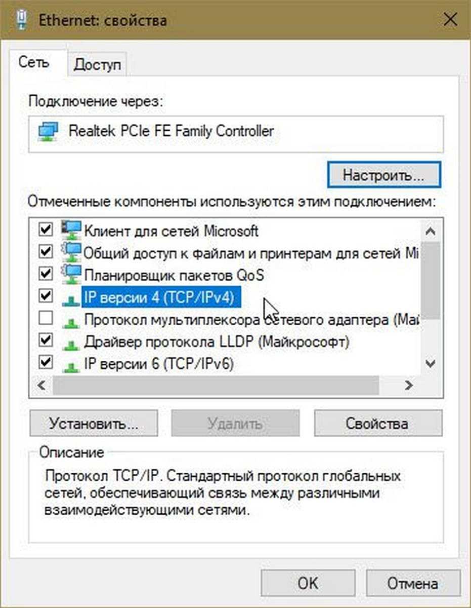 2. В окне свойств подключения выбираем «Протокол Интернета версии 4 (TCP/IPv4)». Жмем «Свойства».