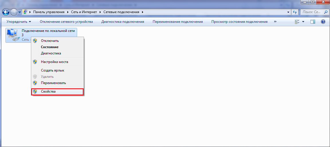 1. Идем в Панель управленияСеть и ИнтернетСетевые подключения и открываем свойства сетевого подключения.