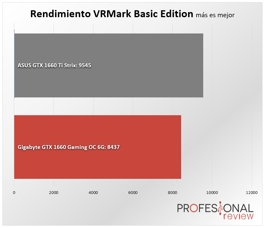 В тесте Time Spy разница снижается до 11, 7%, а в тесте VRMark она практически одинакова. Таким образом, если мы получим среднее значение, мы получим на 1660 14% медленнее, чем 1660 Ti, по крайней мере в этих синтетических тестах.