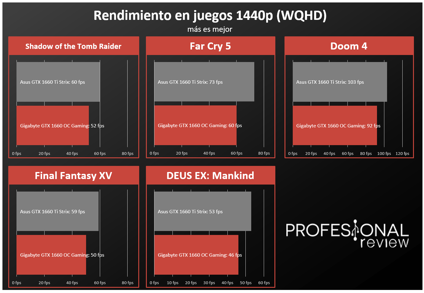 В разрешении 2K различия остаются, между 7 и 13 FPS ниже 1660 Ti, но пропорционально они больше, и мы заметим это во многих играх, таких как DUES EX или Final Fantasy, поскольку они не достигают мечтанных 60 FPS. Конечно, здесь у нас будет возможность загружать графику, пока мы не сможем улучшить производительность, но в недавних играх, таких как Metro или Anthem, это будет очень сложной задачей.