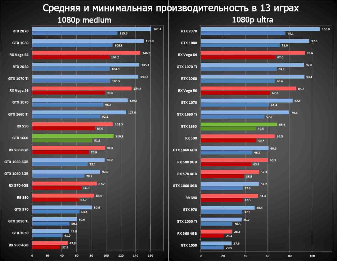 Как видно, у GTX 1660 хорошая производительность. Это примерно на 12% быстрее, чем у GTX 1060 6GB, ничего особенного, но, по крайней мере, быстрее и дешевле. Она также на 20% быстрее, чем 1060 3 ГБ, на 35% быстрее, чем GTX 970, и более чем в два раза быстрее, чем GTX 1050