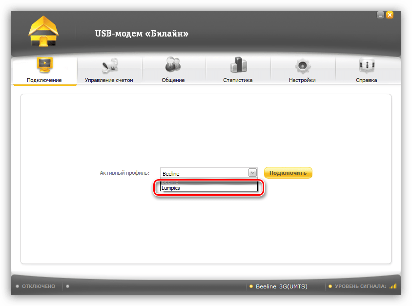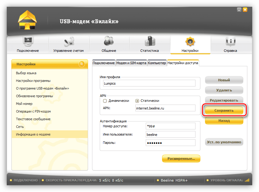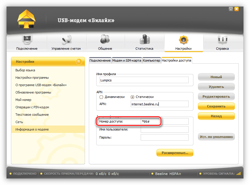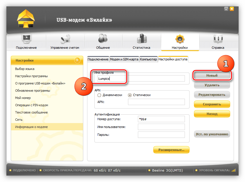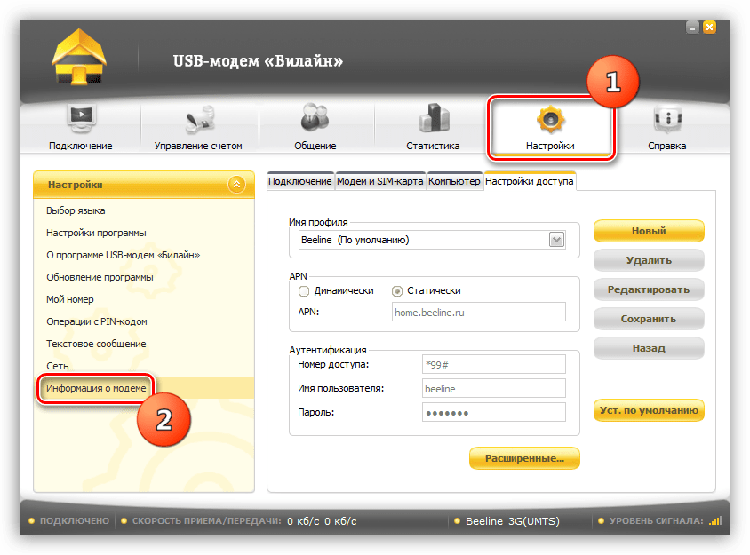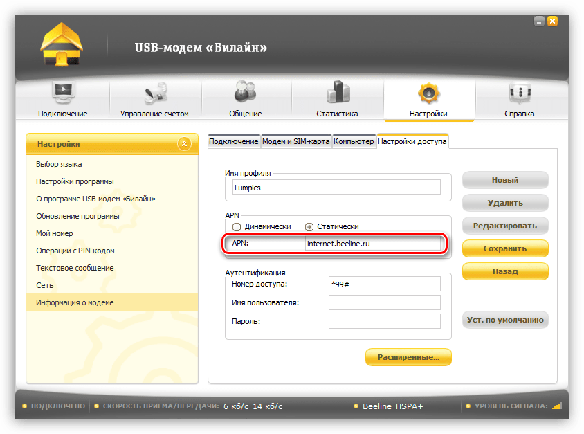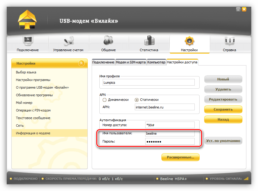 Большинство программ для USB-модемов позволяют настраивать профили подключения. Это дает нам возможность вручную ввести данные, такие как точка доступа, имя пользователя и пароль. Мы уже писали выше, что при сбоях эти настройки могут быть сброшены. Рассмотрим процедуру на примере программы «USB-модем Билайн».