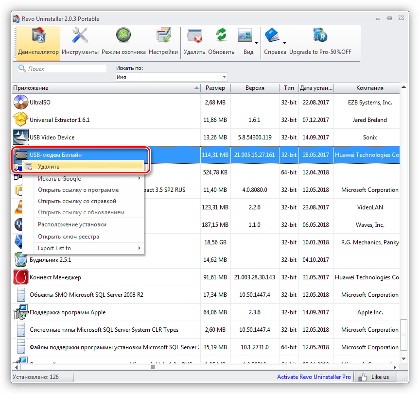 Очередным средством борьбы с ошибками является переустановка софта для модема. Для начала необходимо его деинсталлировать, причем желательно, с помощью специальной программы, например, Revo Uninstaller, которая позволяет избавиться от всех «хвостов», то есть удалить абсолютно все файлы и ключи реестра.