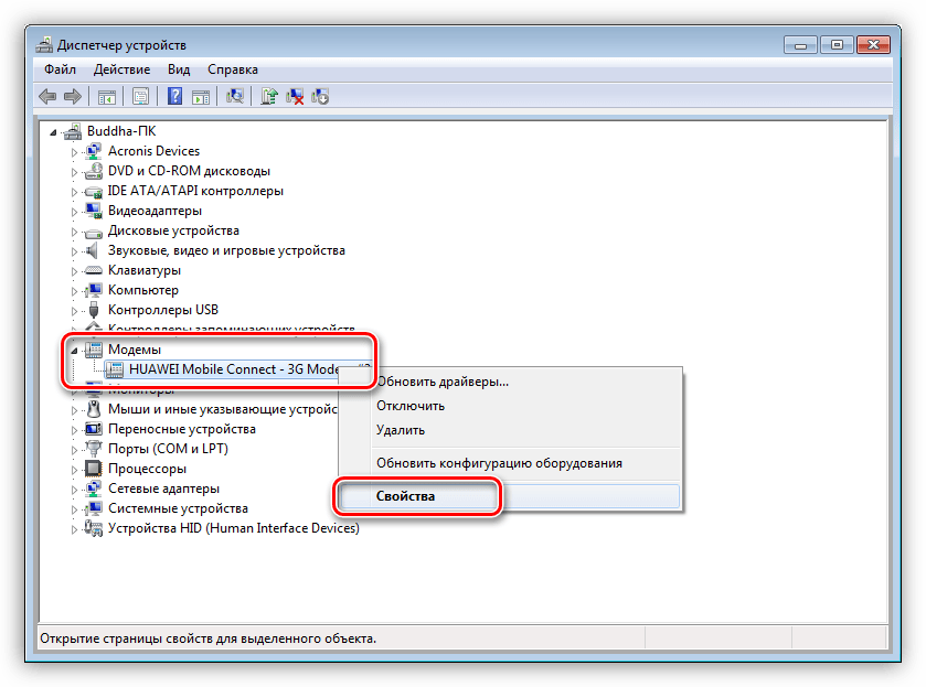- Кликнув правой кнопкой по иконке модема, выбрать «Свойства».