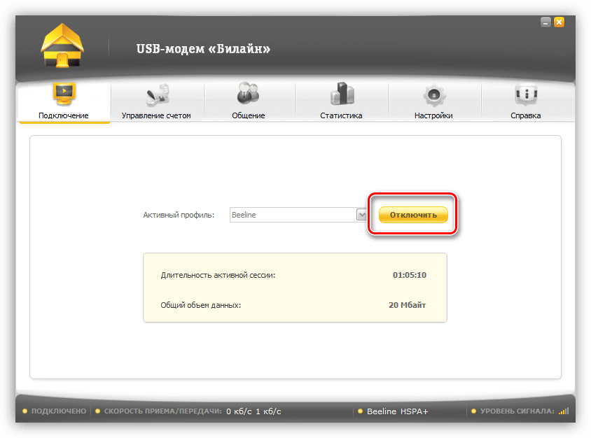 - Разрываем соединение с сетью кнопкой «Отключить» в стартовом окне программы.
