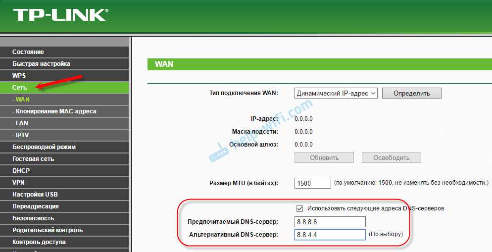 Такое решение помогает очень часто. Если у вас проблема с получение DNS на всех устройствах, которые подключены через один роутер, то эти адреса можно прописать в настройках роутера, тогда они будут применяться для всех устройств. Как правило, сделать это можно в настройках вашего роутера, в разделе «Интернет», или «WAN». Где задаются параметры для подключения к провайдеру.