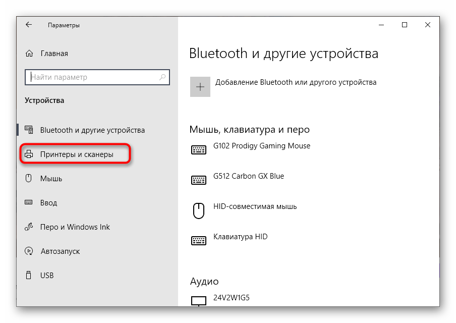 Через левую панель переключитесь в «Принтеры и сканеры».