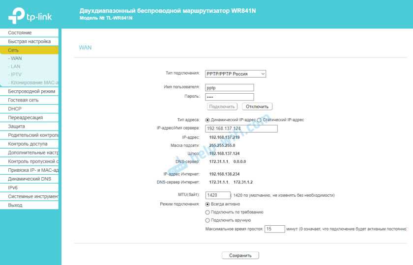 В веб-интерфейсе роутера нужно найти раздел с настройками подключения к интернету. Чаще всего он называется «Интернет», или «WAN». И там нужно правильно задать параметры, которые выдает вам интернет-провайдер. Выбрать тип подключения и указать необходимые параметры, если это необходимо. Все настройки вы можете уточнить у поддержки интернет-провайдера, или посмотреть в договоре о подключении к интернету. Так же необходимо выяснить, делает ли провайдер привязку по MAC-адресу (но это актуально в основном для подключения через «Динамический IP»). Вот так, например, выглядят эти настройки на роутере TP-Link (со старой прошивкой):