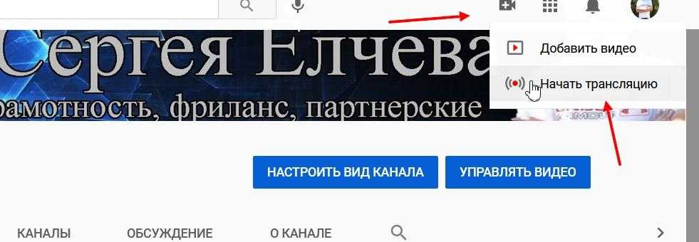 В Ютубе вообще нет проблем в создании трансляций. Рассмотрим этот процесс на компьютере. Переходите в свой канал на Ютуб. Нажимаете по значку видеокамеры сверху и выбираете раздел «Начать трансляцию».