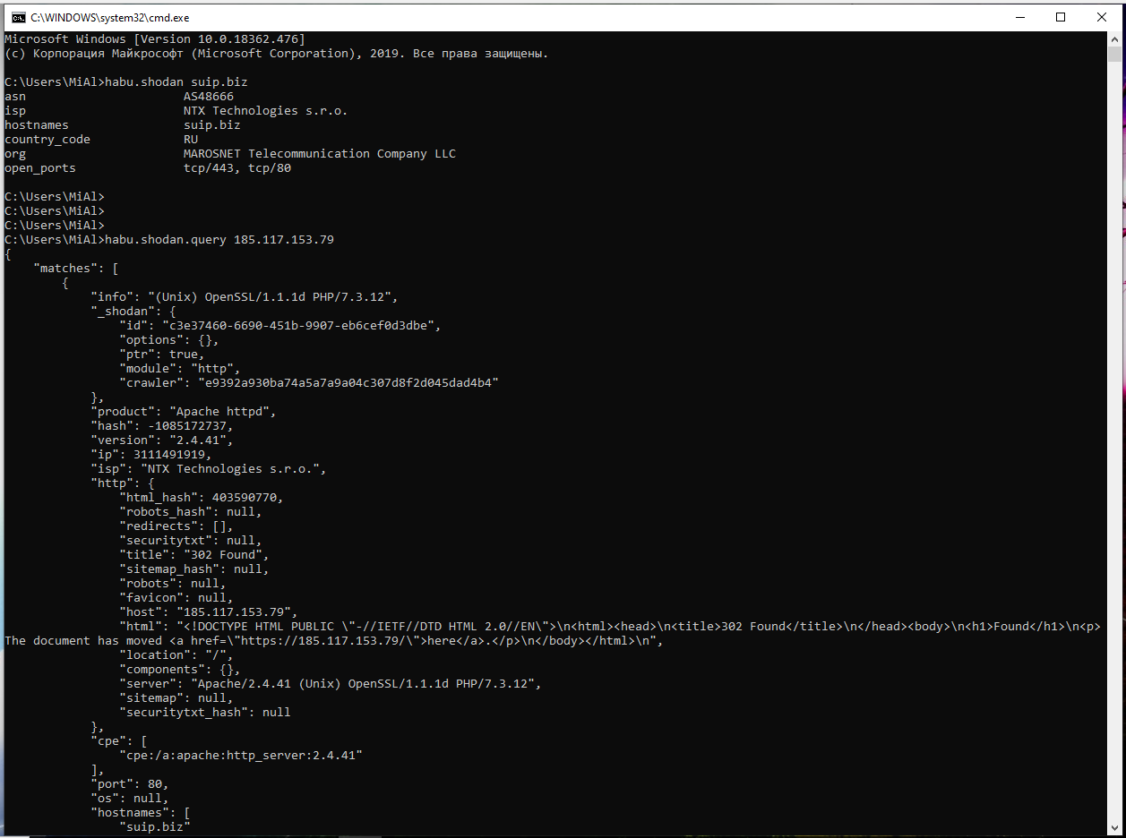 Для запросов к Shodan имеется две утилиты — одна предназначена для получения информации о доменах и запускается следующим образом: