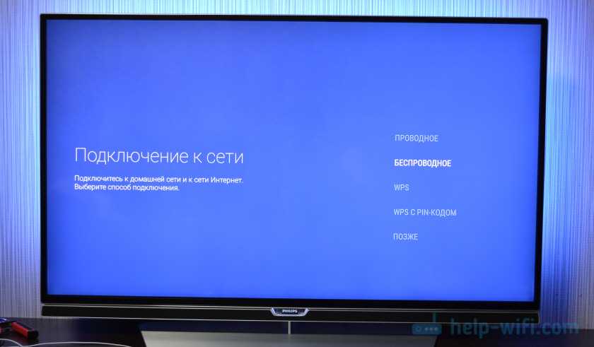 Вы можете сразу зайти в настройки и попробовать подключить телевизор через Wi-Fi. Там нужно только выбрать свою беспроводную сеть из списка и ввести пароль. На фото ниже телевизор Philips с Android TV.