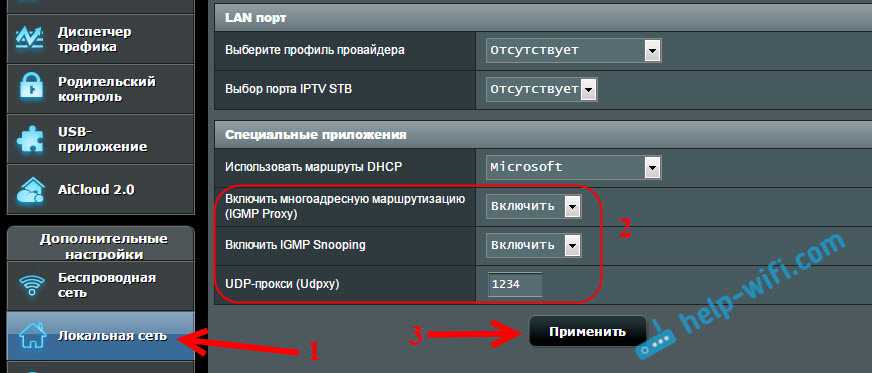 - Напротив «Включить IGMP Snooping» так же выбираем «Включить». Тем самым включаем Multicast на роутере Asus