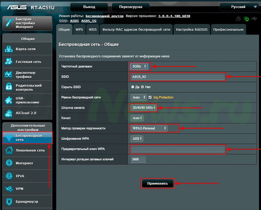 7. Перейдите к разделу “Беспроводная сеть” и выберите “5 GHz” в разделе “Частотный диапазон”. 8. Введите имя вашей беспроводной сети в поле “SSID”. Рекомендуется указывать частоту в названии сети, например, “имя_сети_5”. 9. Выберите “20/40/80 МГц” в поле “Ширина канала”. 10. Установите пароль для беспроводной сети, выбрав “WPA2-Personal” в разделе “Метод проверки подлинности”. 11. Введите пароль в поле “Предварительный ключ WPA” и нажмите “Применить”.