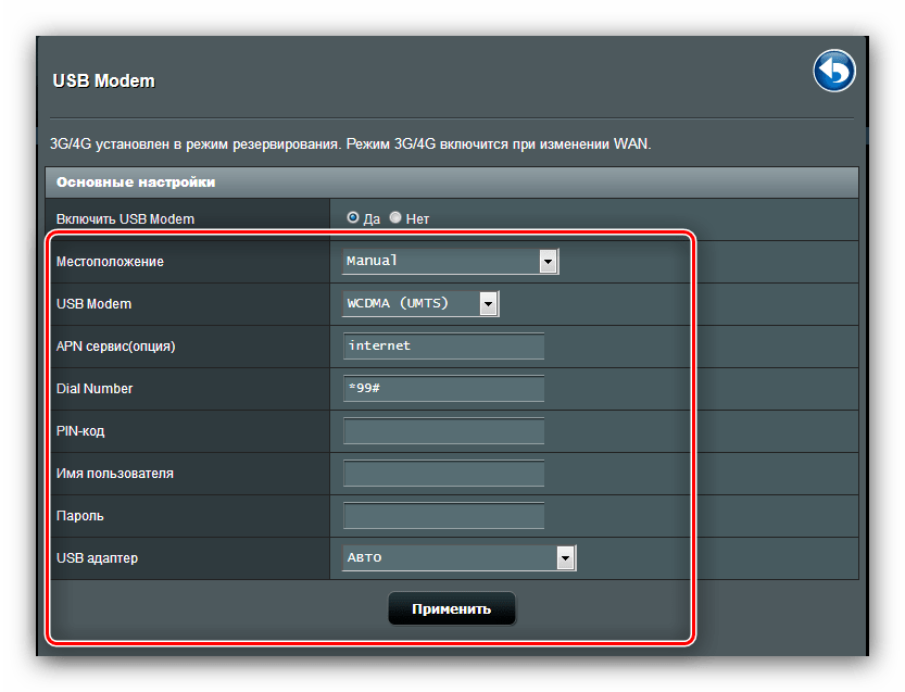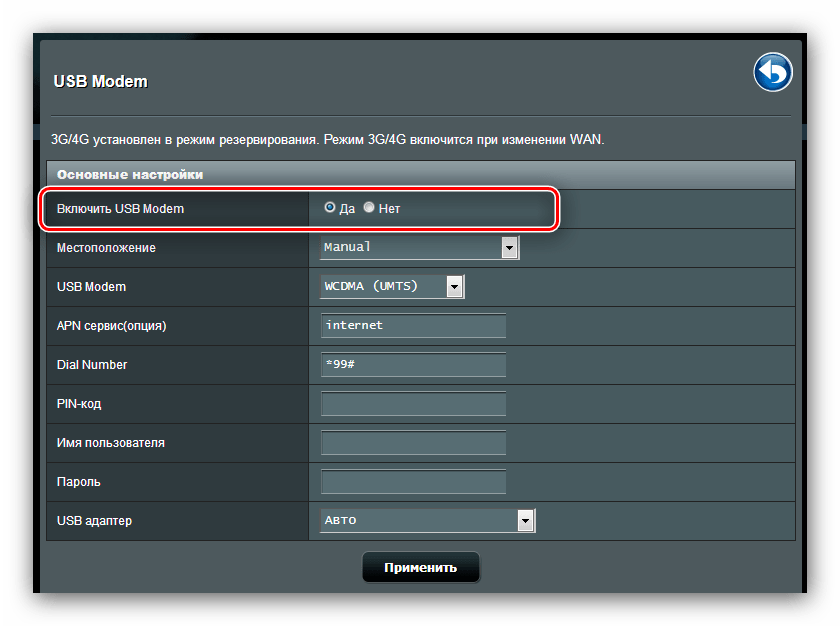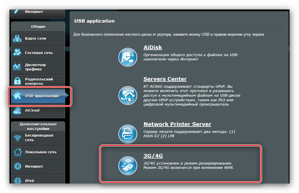 Рассматриваемый роутер умеет принимать соединение с интернетом не только по WAN-кабелю, но и через USB-порт при подключении соответствующего модема. Управление и настройка этой опции расположены в пункте «USB-приложения», вариант «3G/4G».