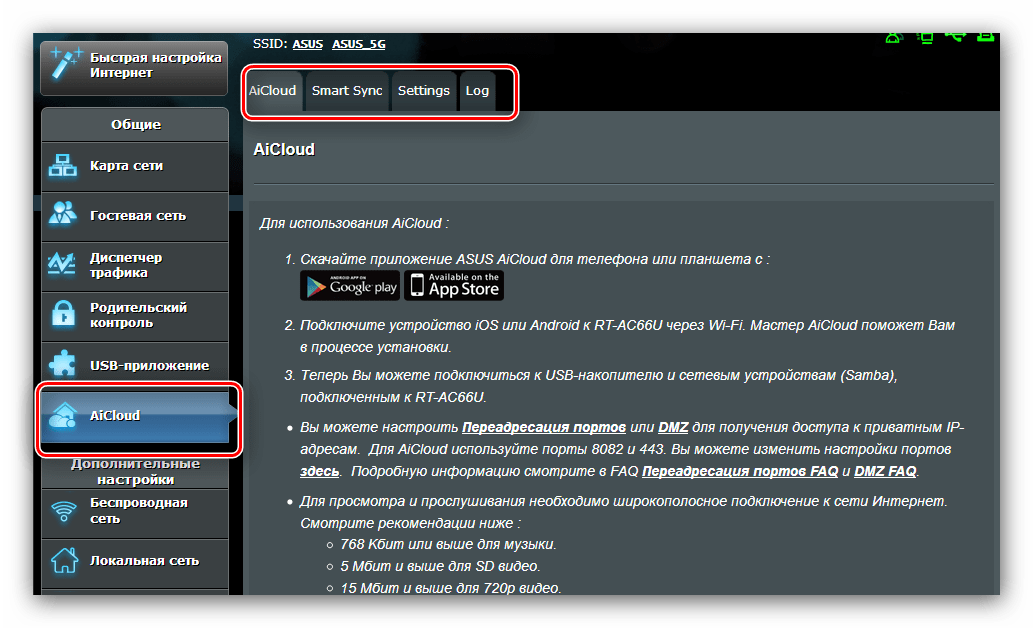 Компания ASUS также предлагает своим пользователям довольно продвинутые облачные технологии, названные как AiCloud. Под эту опцию выделен целый раздел главного меню конфигуратора.