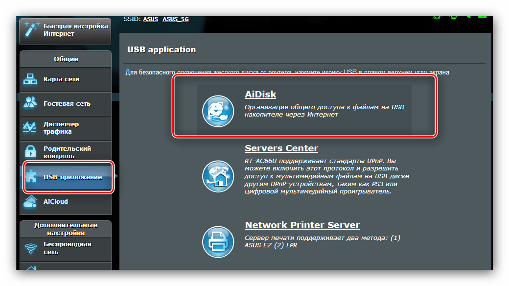 В новейших роутерах ASUS присутствует любопытная опция удалённого доступа к жесткому диску, который подключён к USB-порту устройства – AiDisk. Управление этой опцией расположено в разделе «USB-приложения».