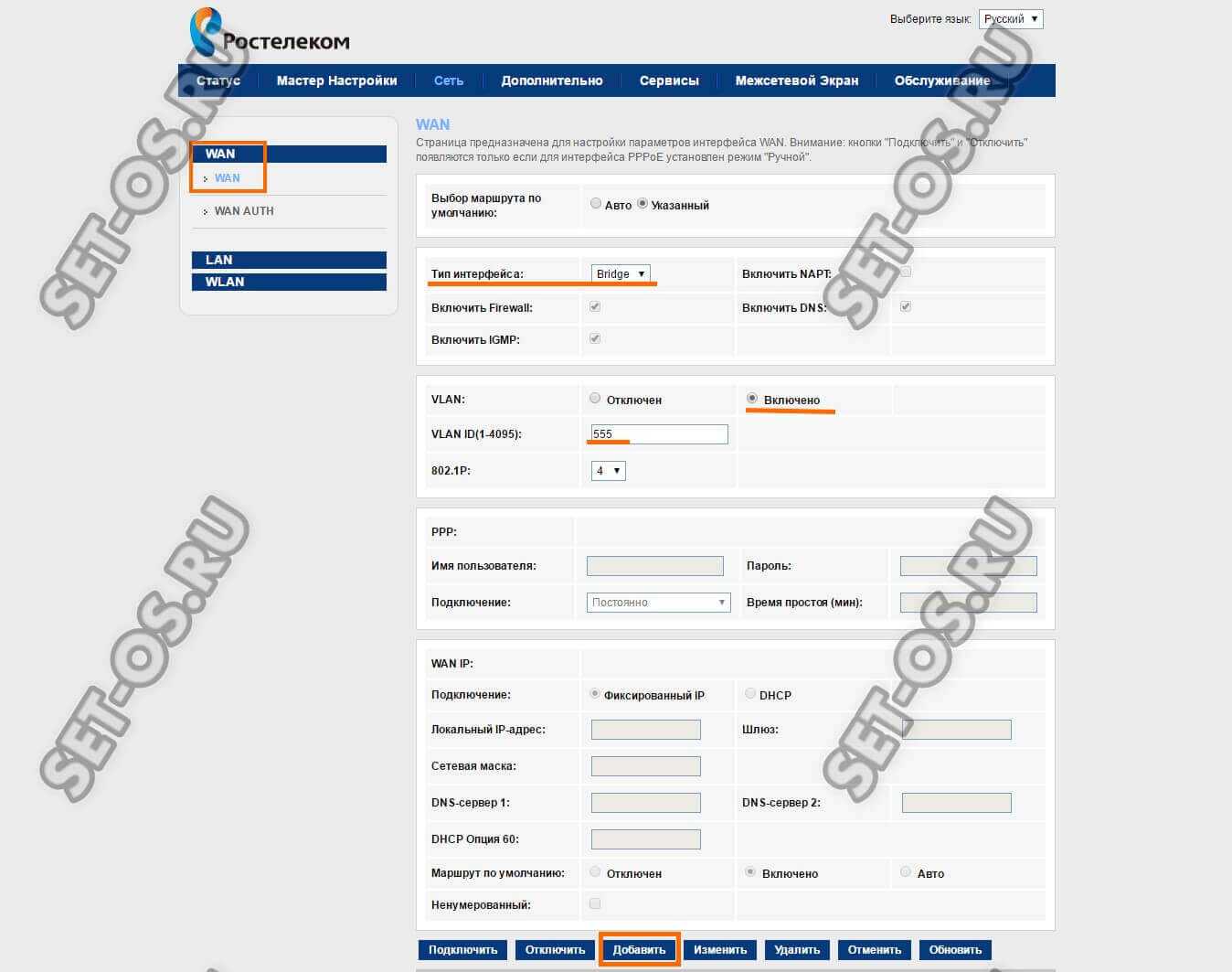 Если в Вашем филиале для работы Ростелеком ТВ необходимо указать идентификатор VLAN, то в этом случае надо поставить флажок «Включено», а в поле VLAN ID прописать номер используемого влана. Узнать его можно в технической поддержке. В поле 802.1P устанавливаем приоритет 4. Нажимаем кнопку «Добавить».