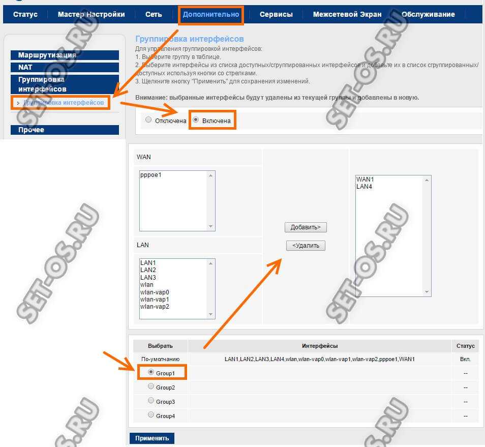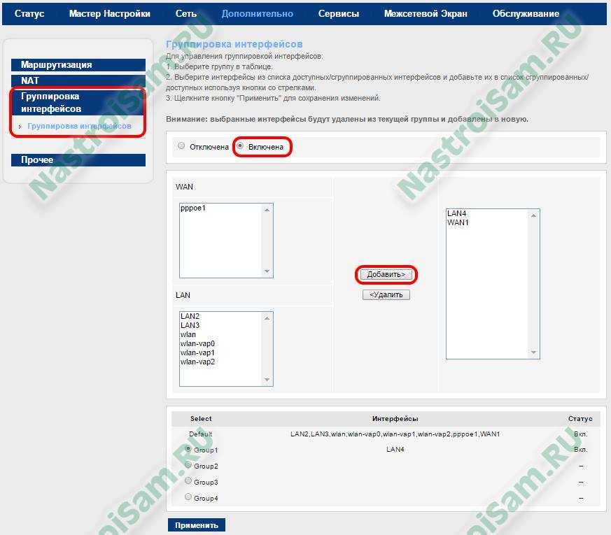 Сначала её надо включить. Следом надо будет поставить точку на группе Group1. Выше, с помощью кнопки «Добавить», надо из полей слева перенести в поле справа созданные интерфейс типа Bridge (в примере это WAN1) и порт, в который будет включаться ТВ-приставка. У меня это 4-й LAN-порт. Нажимаем на кнопку Применить.