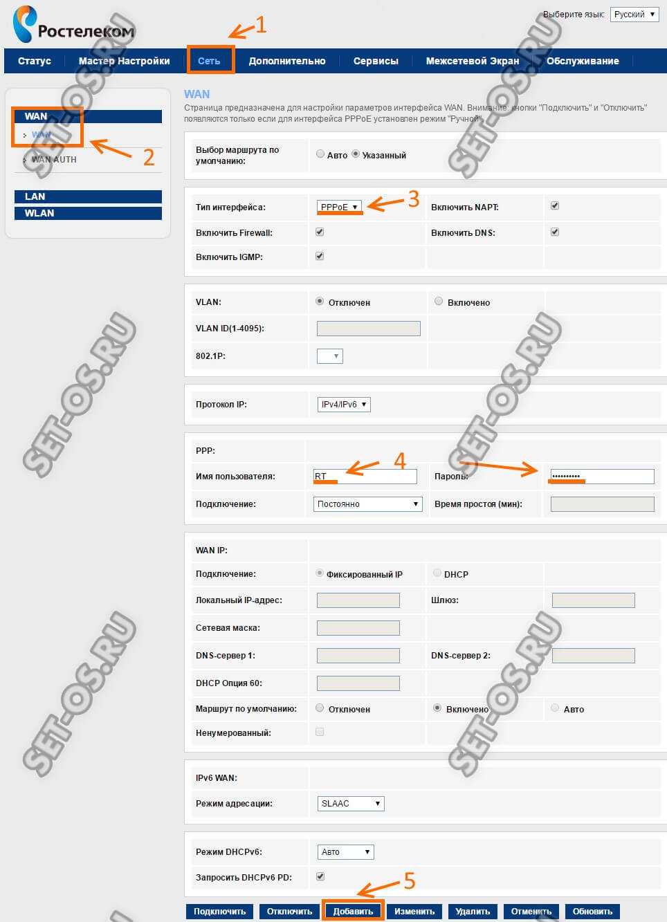 В поле «Тип интерфейса» надо выбрать используемый в филиале протокол. У нас в Ростелекоме используется PPPoE — его и ставим. Ниже будет подраздел PPP в котором надо указать «Имя пользователя» и «Пароль» на подключение (обычно выдаётся на карточке агентом при подписании договора). Нажмите кнопку «Добавить» чтобы запомнить соединение на роутере.