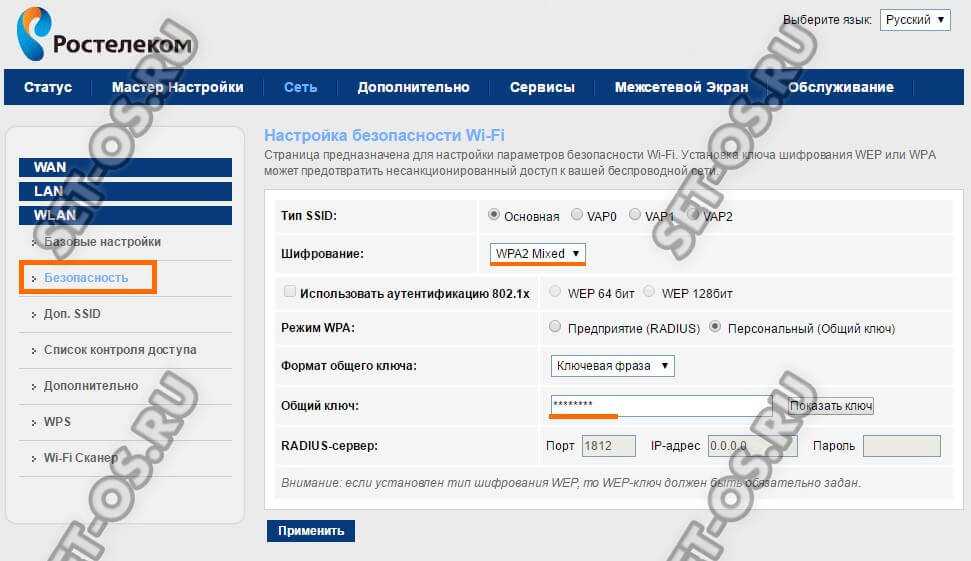 Здесь надо в поле Тип SSID поставить флажок «Основная». Тип шифрования ставим «WPA2 Mixed». Режим работы WPA — «Персональный (Общий ключ)» с форматом «Ключевая фраза». Остаётся только в поле «Общий ключ» ввести пароль на WiFi. В этом качестве можно использовать любую последовательность цифр или букв латинского алфавита не короче 8 символов. Применяем настройки.