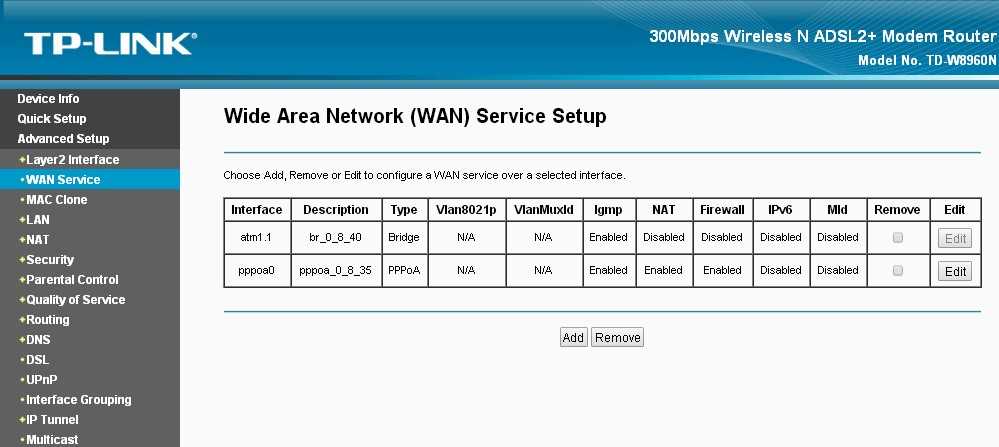 Выберите «Дополнительные настройки» в меню слева и перейдите в «Wan Service». Нажмите «ДОБАВИТЬ», чтобы создать соединение.