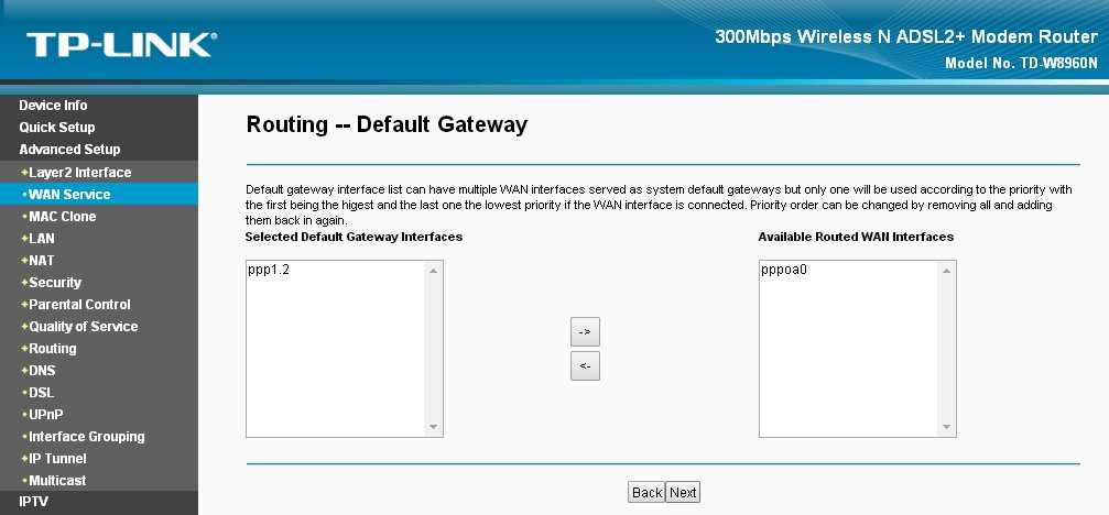 Теперь нужно выбрать тип подключения, используемый провайдером, в строке «Выберите тип услуги WAN». Кроме того, процедура будет отличаться в зависимости от провайдера. Рассмотрим, как выглядит конфигурация TP-LINK TD-W8960N для Ростелеком (провайдер использует протокол PPPoE).
