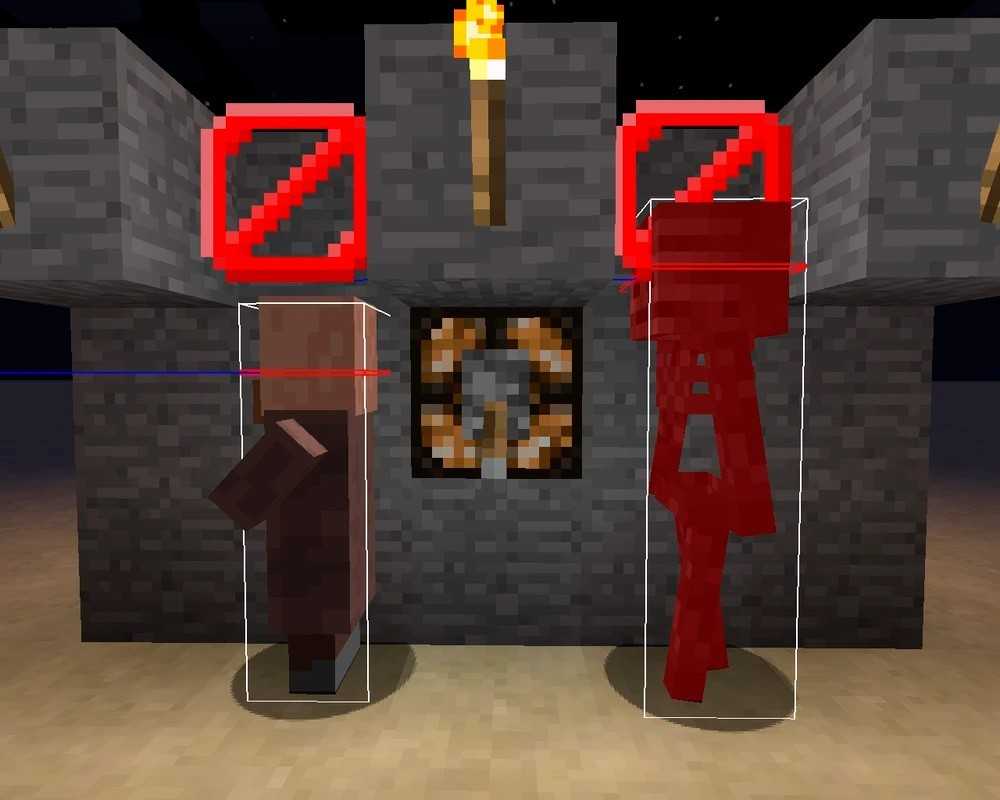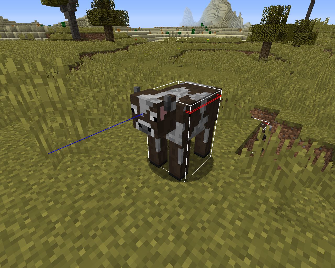Hitboxes также будут отображать линии обзора сущности. Это большой красный прямоугольник, окружающий всю голову. Вот почему игроки не могут подкрасться к мобам, они запрограммированы на то, чтобы буквально видеть глаза на затылке. Игроки все еще могут узнать, в какую сторону смотрит сущность, посмотрев на синюю линию, идущую от глаз.