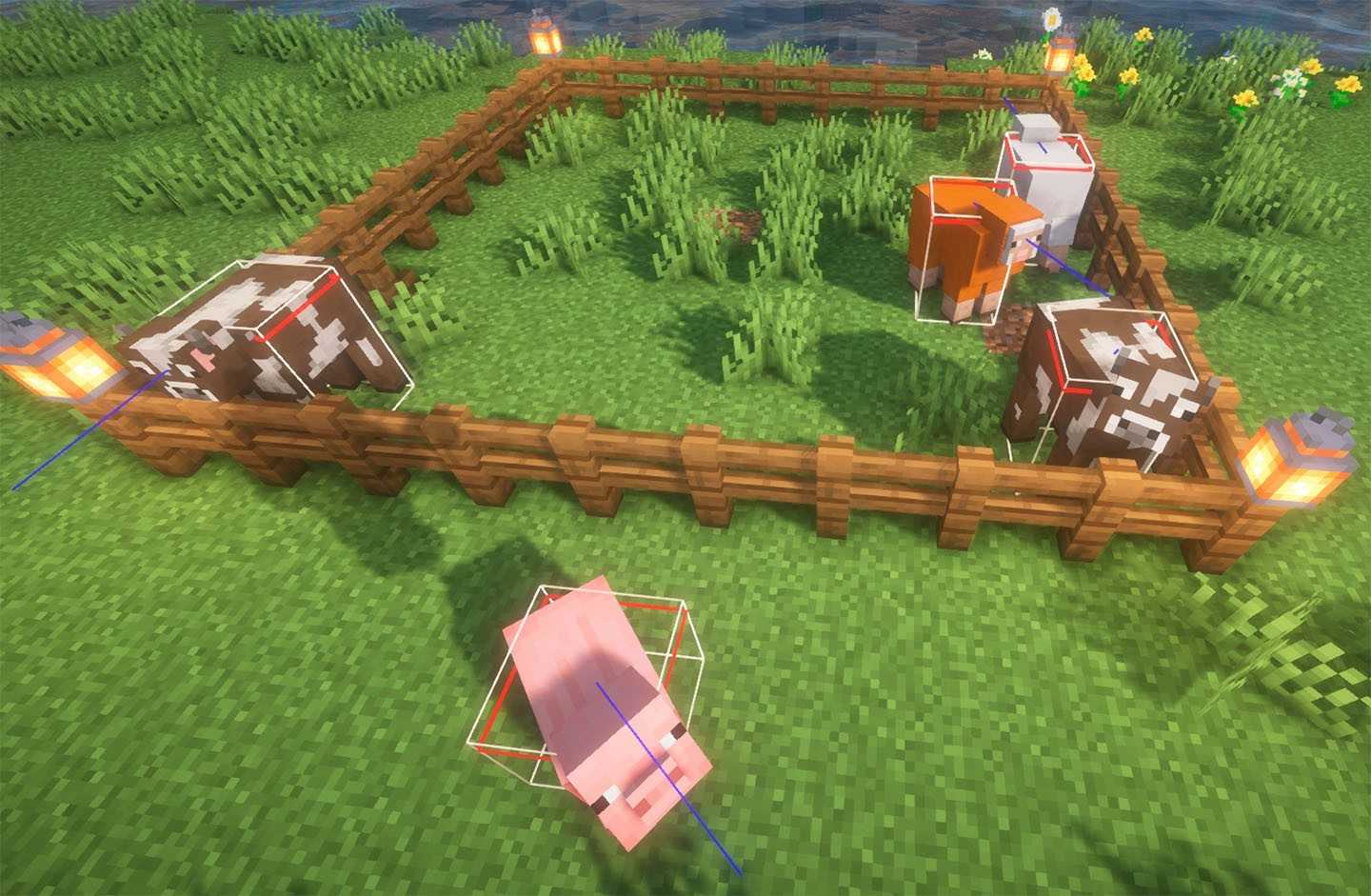 Когда хитбоксы включены, вокруг отображается белая линия, образующая прямоугольник.на что бы ни смотрели игроки. Эти коробки также не всегда совпадают с точной формой сущностей, иногда будут торчать различные части тела