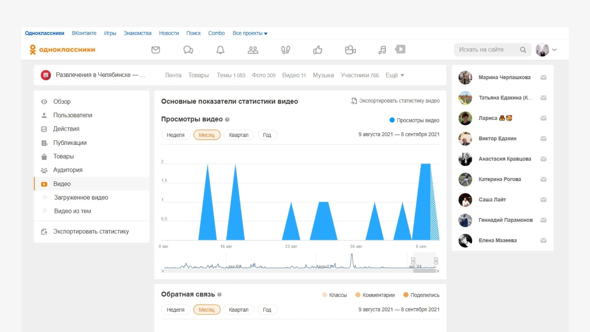 «Видео» – раздел с общим показателем просмотров и обратной связи для всех видео. Можно посмотреть на графике, какие ролики из постов или раздела «Видео» собрали больше просмотров за указанный период.