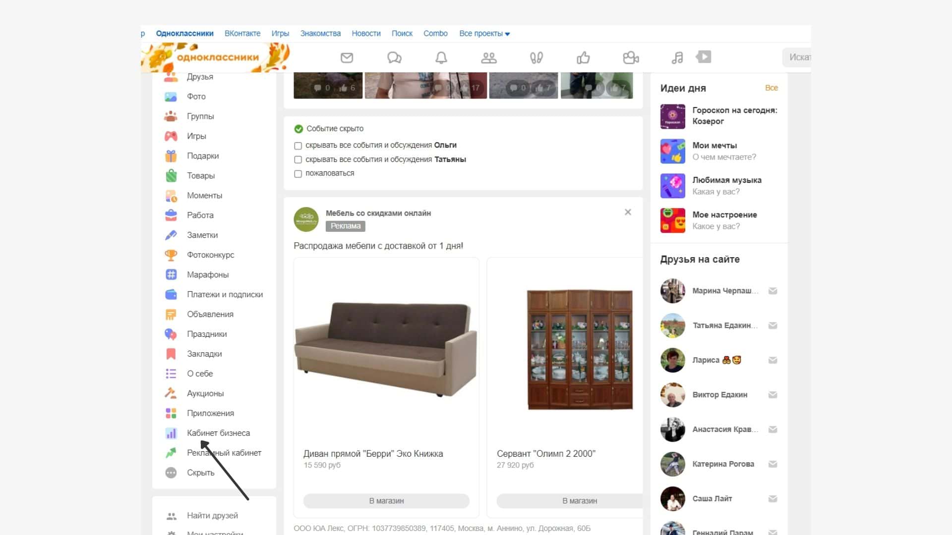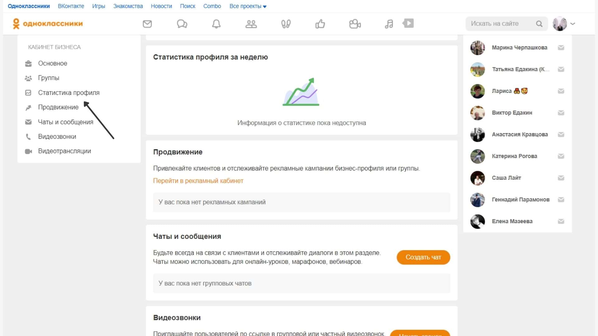 Данные доступны для всех профилей, у которых более 100 друзей. Чтобы посмотреть статистику, нажмите «Еще» в меню под аватаркой и выберите раздел «Кабинет бизнеса». Этот же раздел можно найти в «Настройках».