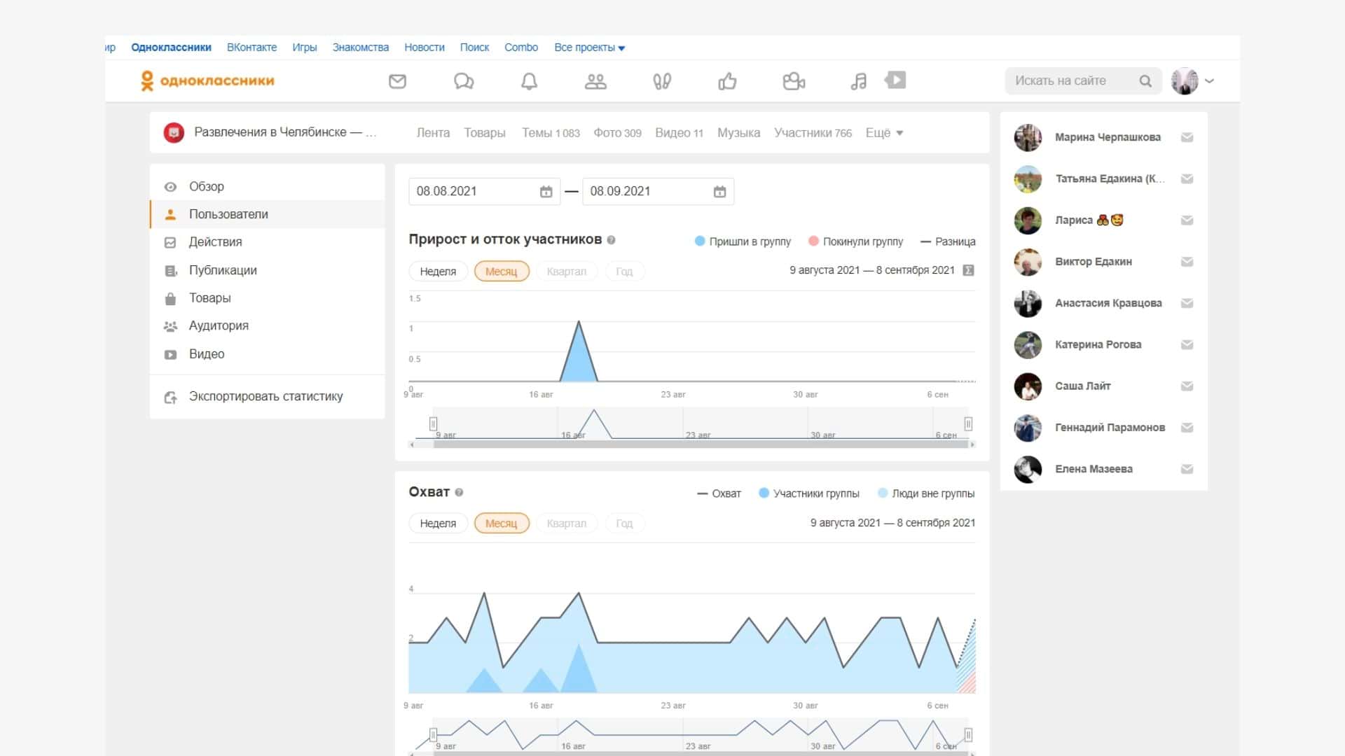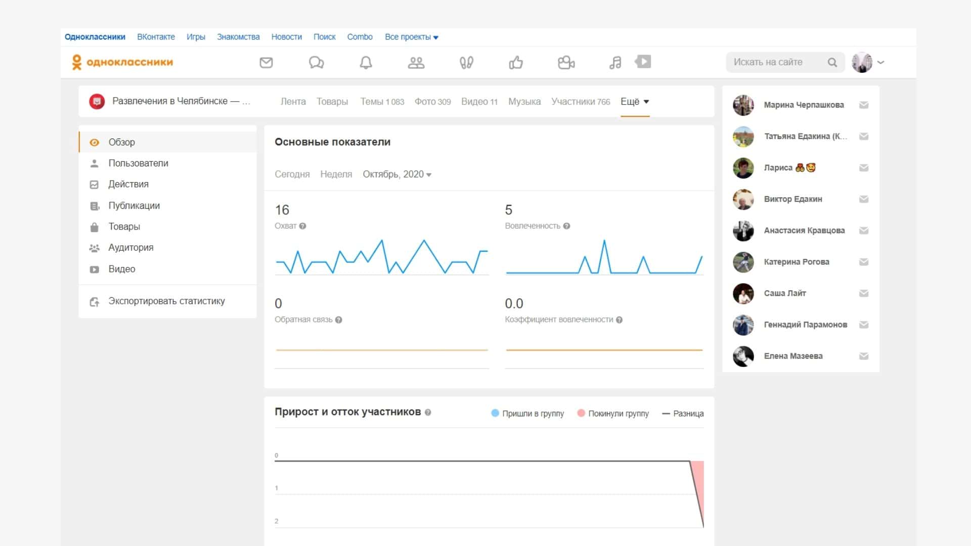 «Пользователи» – детальная сводка по подписчикам в виде графика. Можно посмотреть динамику прироста или оттока аудитории, охваты, вовлченность и общее число участников.