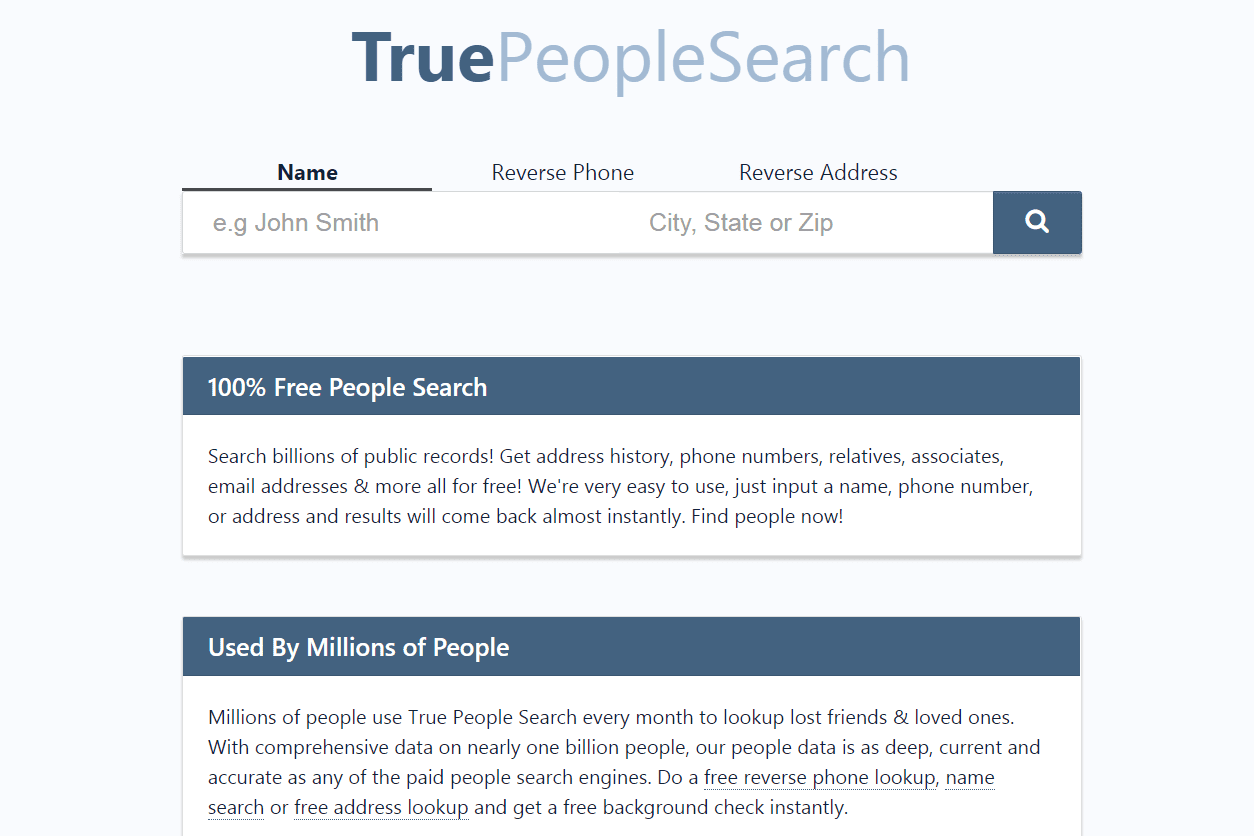 TruePeopleSearch.com позволяет вам найти людей по имени, номеру телефона или адресу. Это одна из лучших поисковых систем для людей, потому что бесплатные результаты гораздо более детальны, чем на других сайтах.