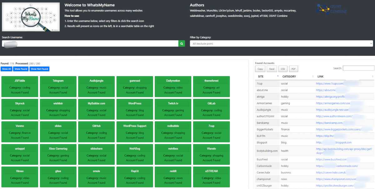WhatsMyName — это не просто сервис, а целый комбайн, который ищет по 280 сервисам!