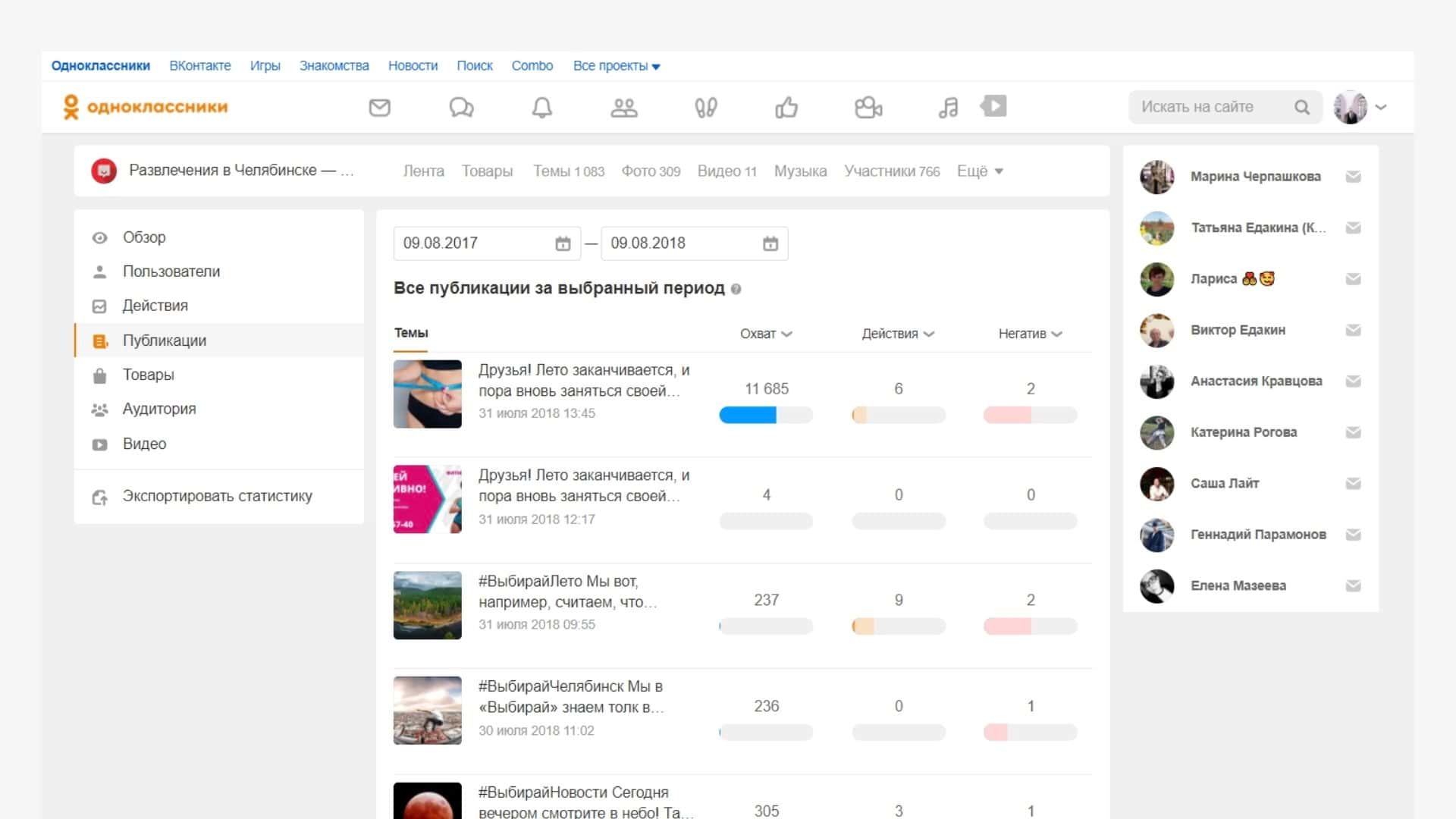 «Публикации» – раздел со статистикой всех вышедших постов: охваты, лайки и негативные действия.
