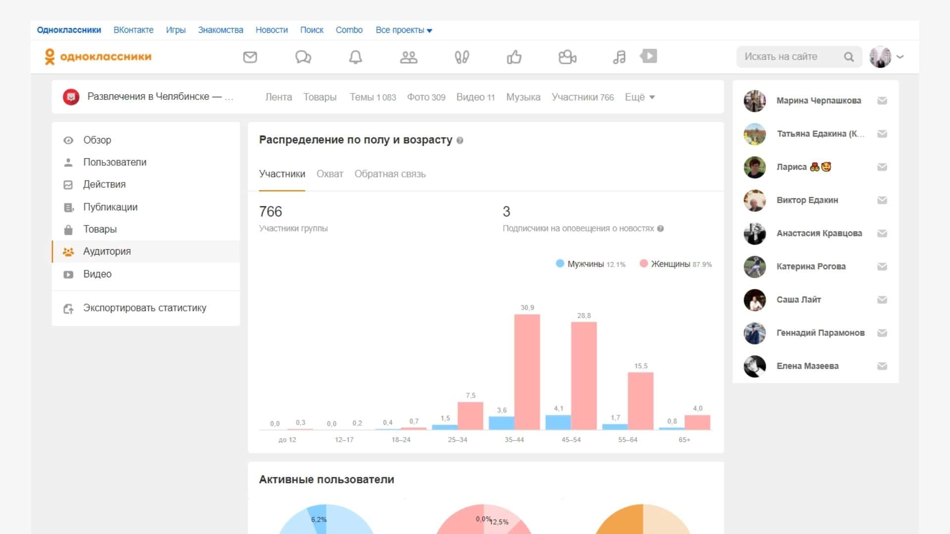 «Аудитория» – какие демографические группы занимают большую долю, как реагирует активное ядро группы, из каких источников совершают больше всего переходов.