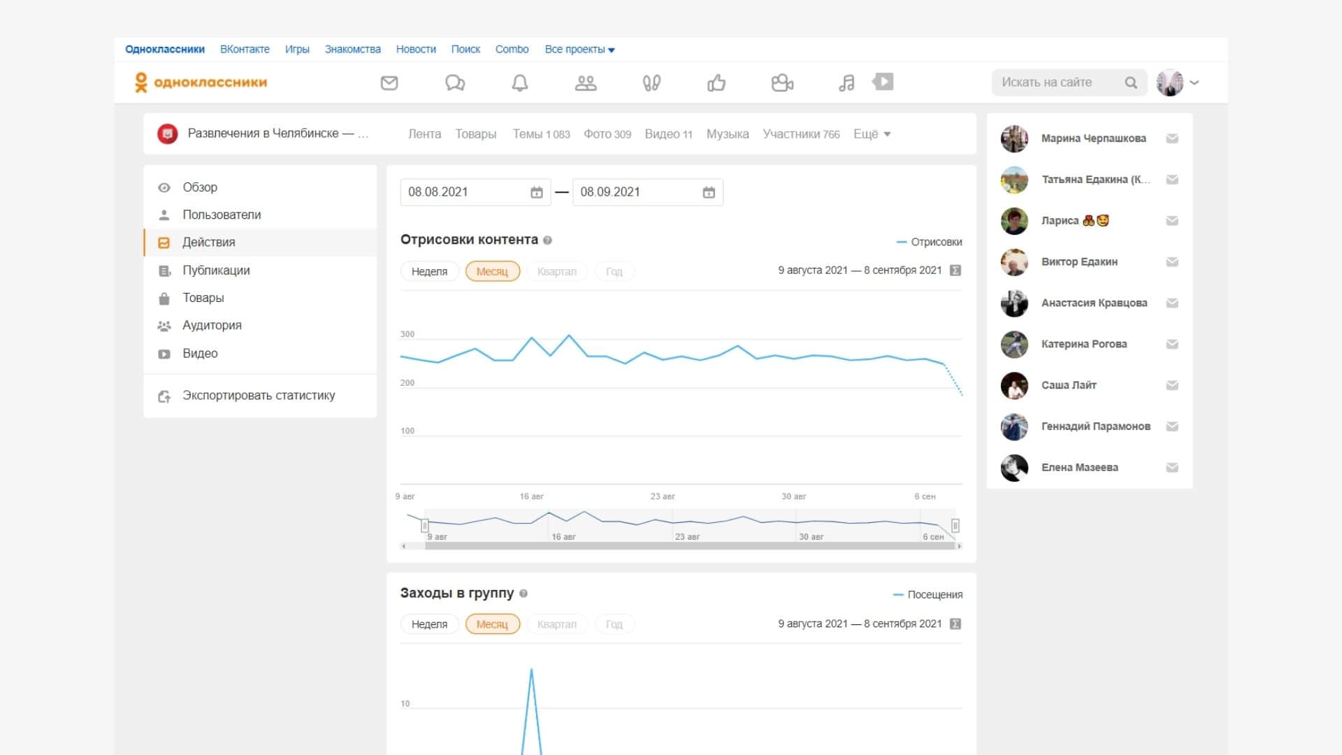 «Действия» – активность в группе: как часто ставят лайки, смотря фото и видео, сколько негативных действий совершают. Есть график «Отрисовка контента» – количество всех показов контента.