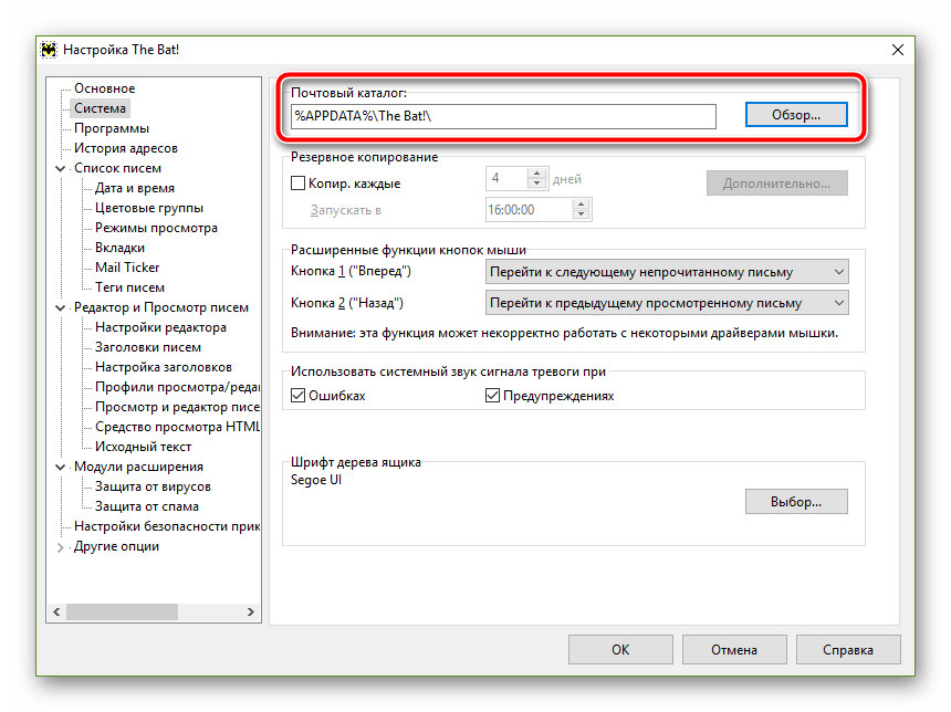 Путь к данной папке можно найти в меню клиента «Свойства» — «Настройка» — «Система» в пункте «Почтовый каталог».