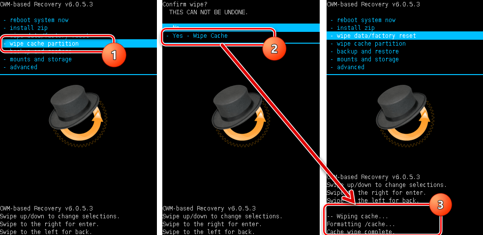 - Wipe cashe — функция для форматирования раздела с кэшем;